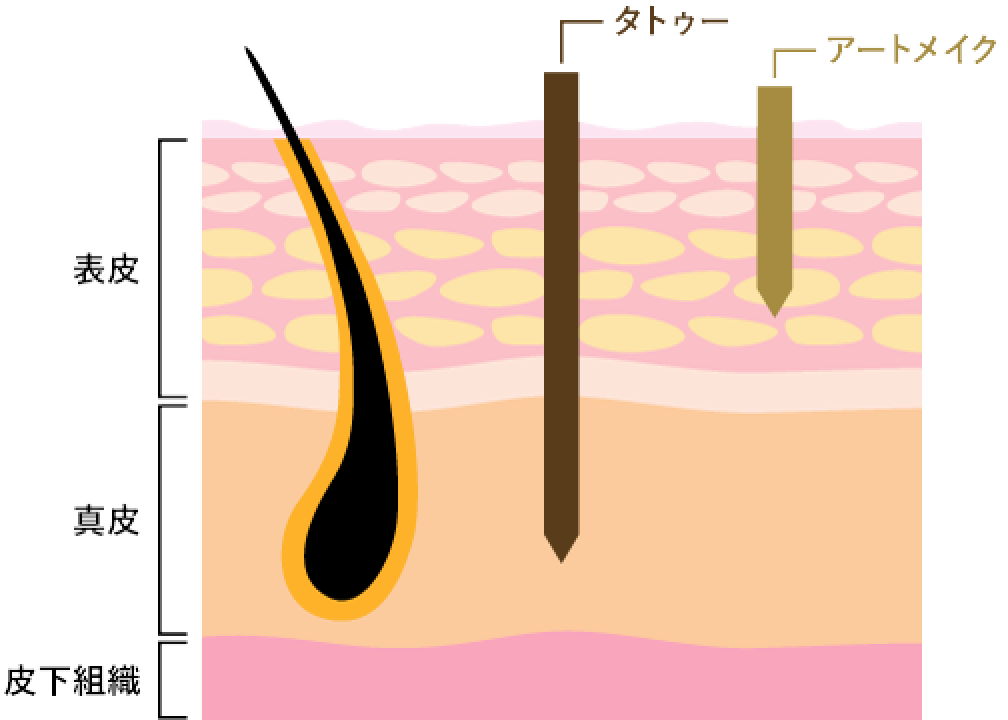 医療アートメイクは、表皮という皮膚の一番上の部分にのみ色味をつける施術です。個人差はありますが一度着色すると1〜2年程度持続します。